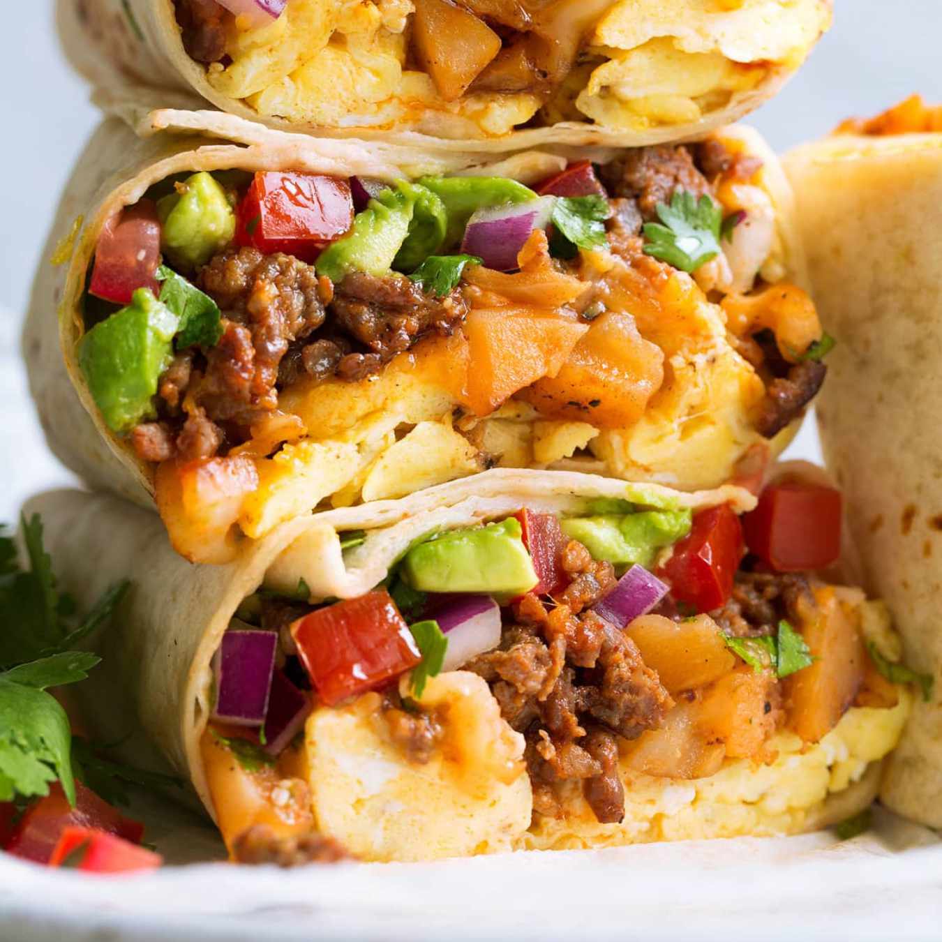 Đặt bánh Burrito trứng lên đĩa, thêm hỗn hợp thịt bò, hành và ngò rồi cuộn