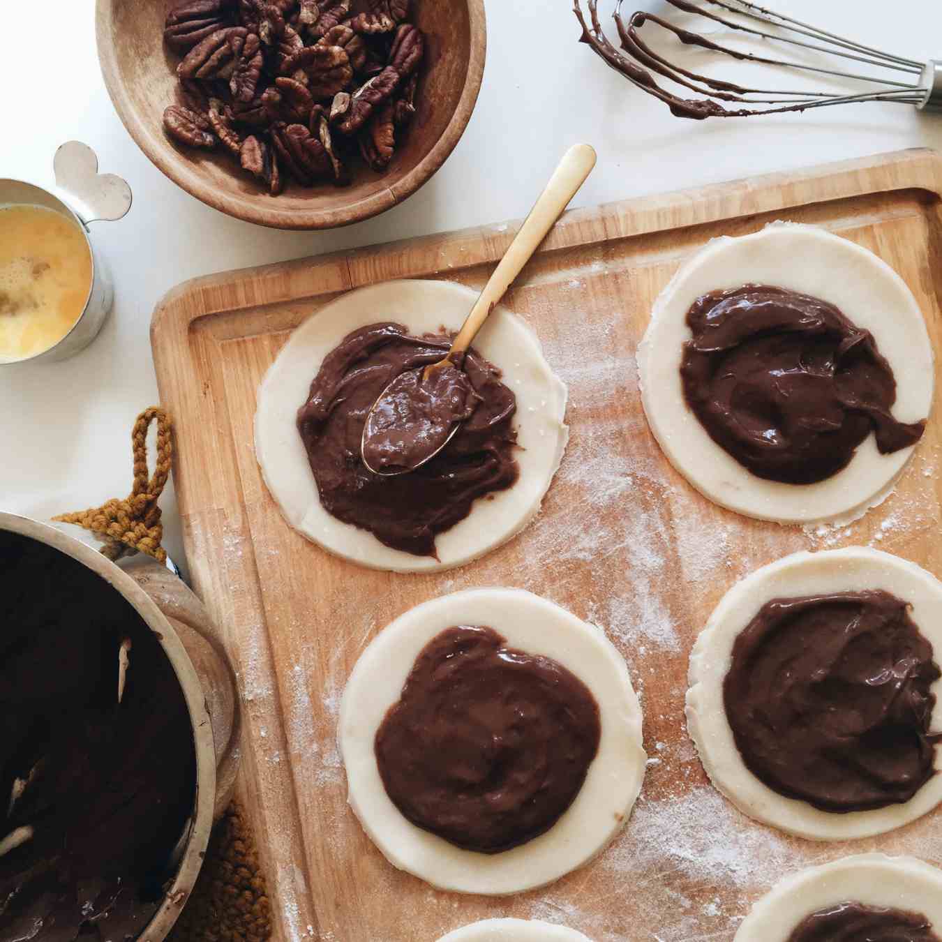 Sau 20 phút, lấy khay Muffin ra khỏi tủ lạnh và đổ hỗn hợp cacao vào từng khuôn bánh cho đầy khay Muffin