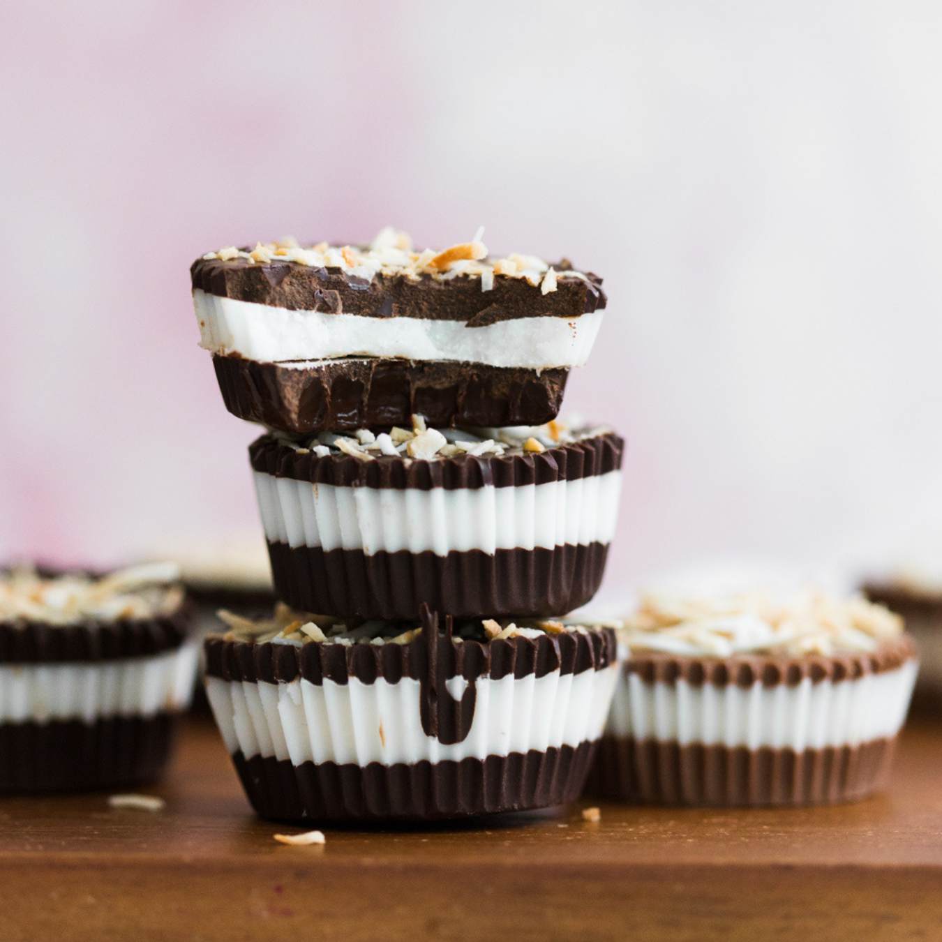 Phần lớp dưới cùng: trộn bơ dừa và dầu dừa trong một chảo nhỏ đặt trên lửa nhỏ. Khuấy đều cho đến khi tan chảy rồi sau đó thêm dừa bào sợi và đường vào khuấy tiếp cho đến khi kết hợp đều