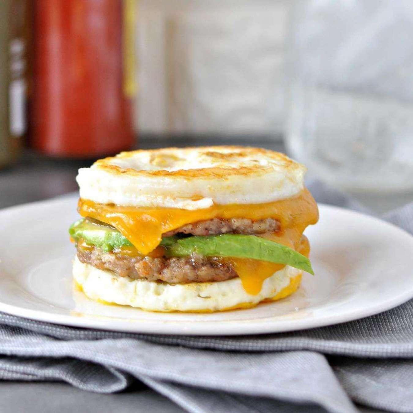 Đặt miếng xúc xích lên một bánh mì bằng trứng, phết sốt Guacamole lên trên và xếp miếng bánh trứng còn lại lên trên cùng