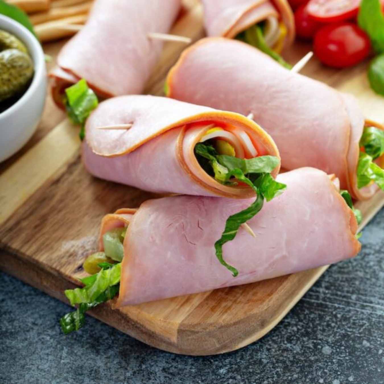Sau đó đặt một lát giăm bông lên trên và phết hỗn hợp phô mai kem đều lên các lát giăm bông