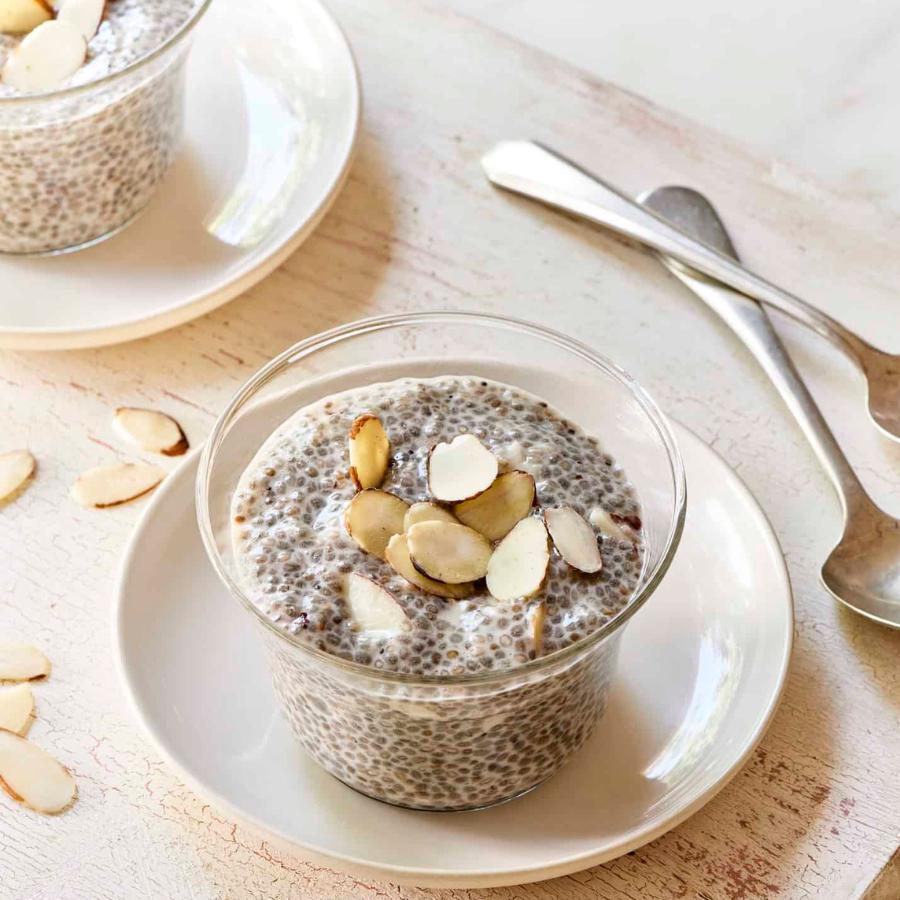 Dùng một chiếc chảo, trộn sữa hạnh nhân với hạt chia, hạt hạnh nhân và các thành phần nguyên liệu khác, đánh đều, đun nhỏ lửa và nấu trên lửa vừa trong 15 phút