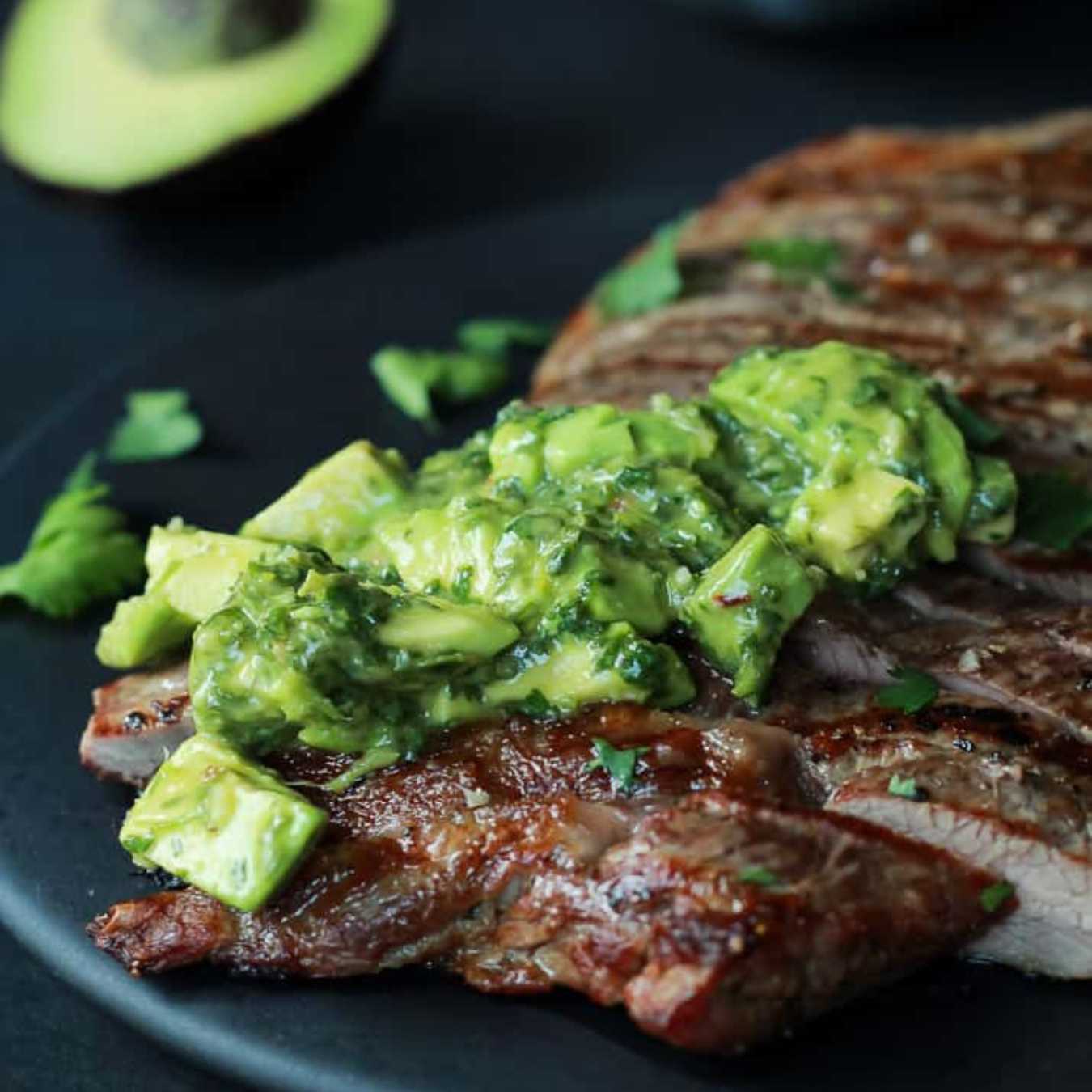 Chia miếng bít tết vào 4 đĩa, thêm phô mai, kem chua, sốt Guacamole lên trên và rưới thêm một chút sốt cay