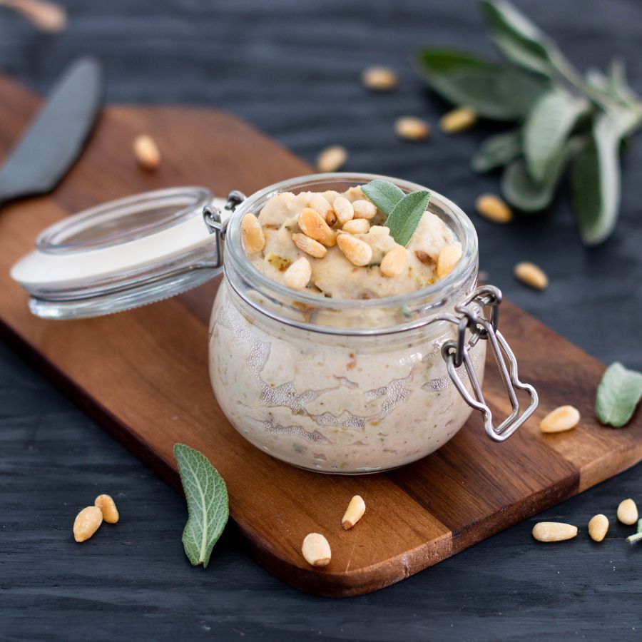 Dùng một chiếc nồi, cho hạnh nhân với hạt thông, kem dừa và các thành phần khác, khuấy đều, nấu trên lửa vừa trong 15 phút và chuyển hỗn hợp vào máy xay thực phẩm