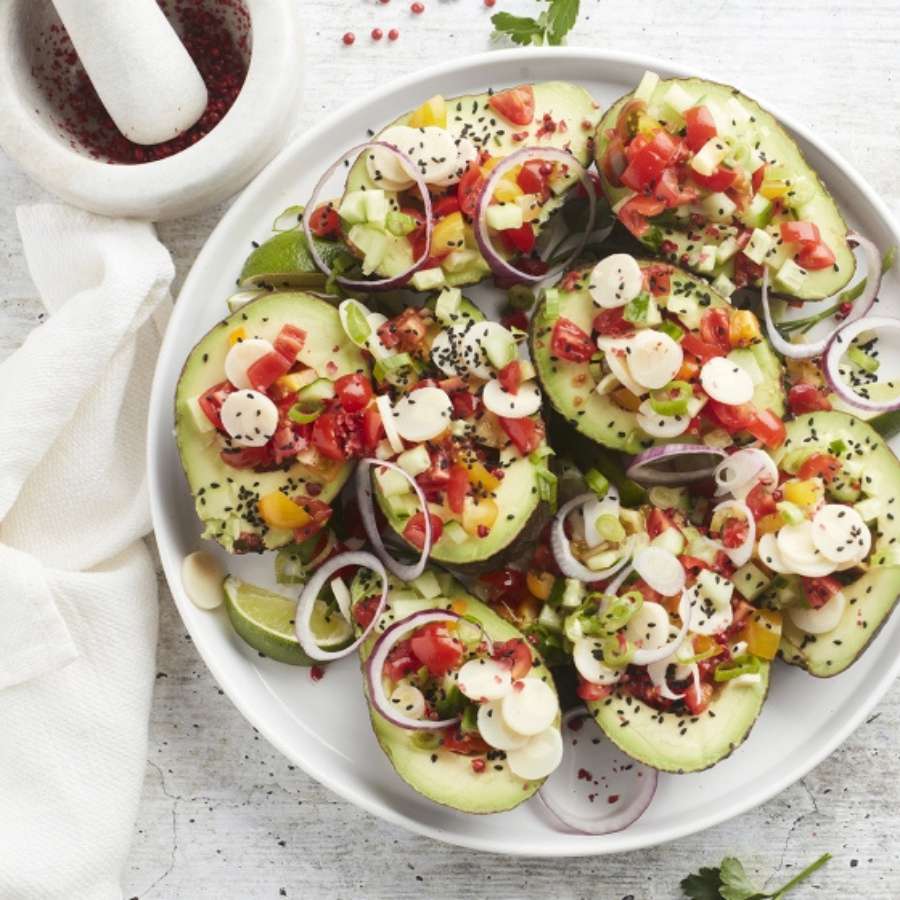 Dùng một cái bát, trộn cà chua với dưa chuột, hành lá và các nguyên liệu còn lại (trừ trái bơ), trộn đều rồi nhồi hỗn hợp này vào nửa quả bơ và thưởng thức