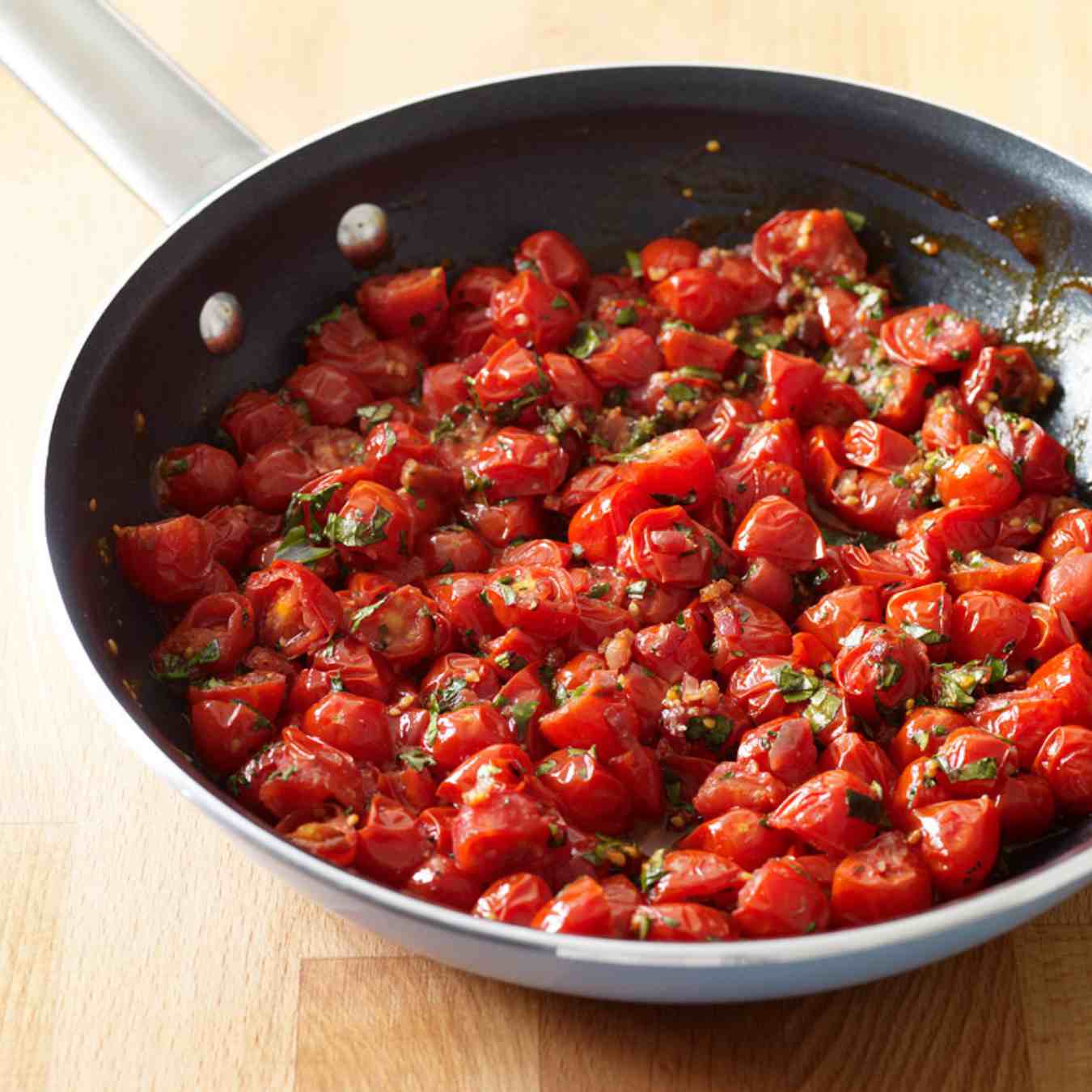 Cho cà chua và các nguyên liệu khác vào, đảo đều, nấu trên lửa vừa trong 10 phút nữa, chia ra đĩa và thưởng thức