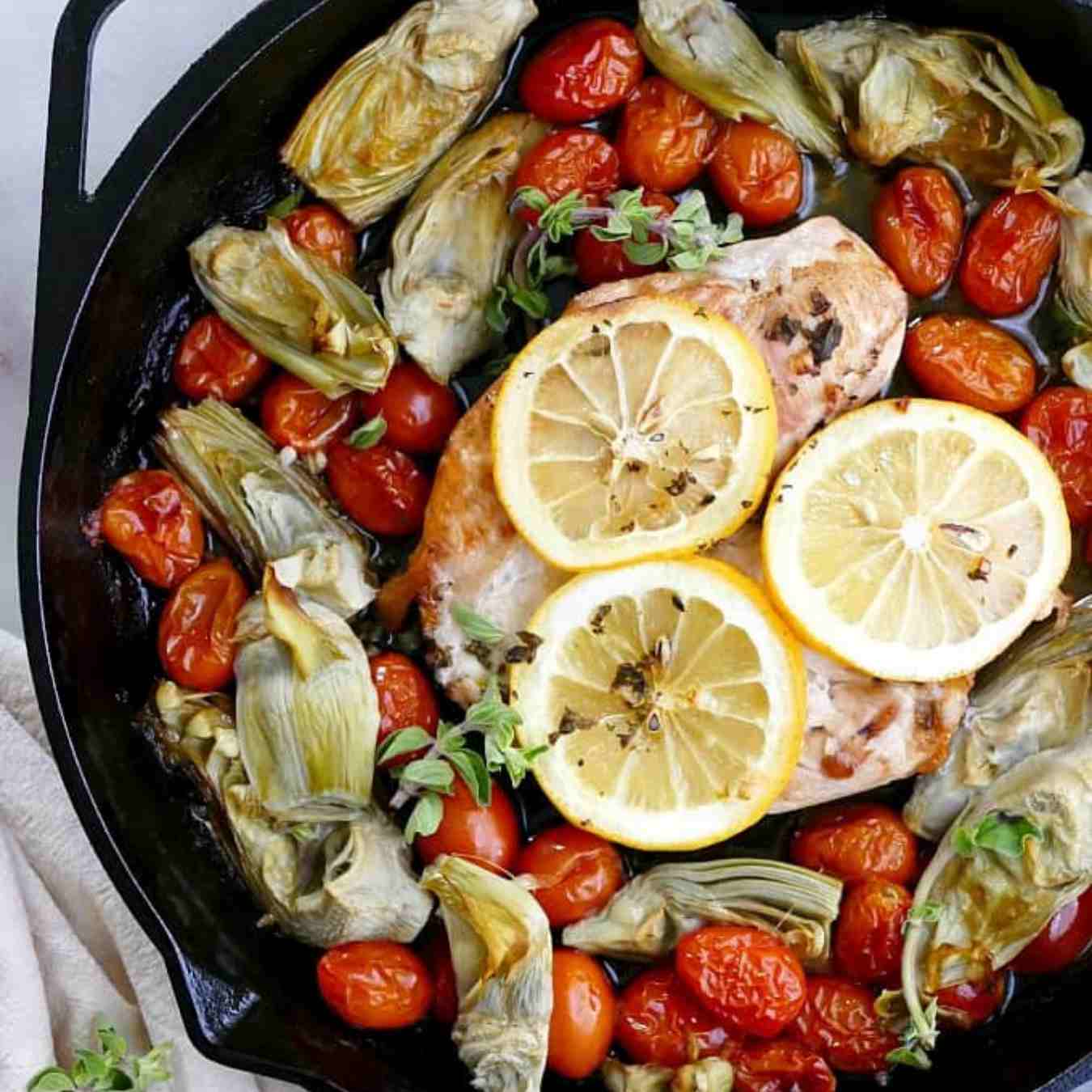 Dùng một cái khay nướng, cho cà chua với atisô, hương thảo và các thành phần nguyên liệu khác vào, đảo nhẹ và nướng ở nhiệt độ 200° (390°F) trong 30 phút