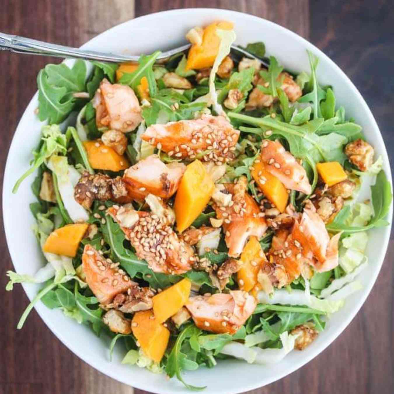 Cho phi lê cá hồi vào, rưới nốt phần sốt Sriracha còn lại và thêm Stevia lên trên cùng với hạt hướng dương và hành lá đã để ráo nước