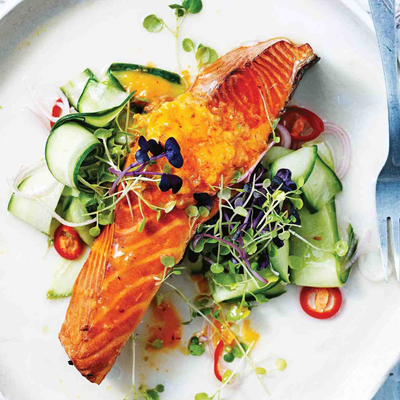 Chà xát lên cá hồi với hỗn hợp muối, tiêu và kim chi rồi cho vào khay nướng
