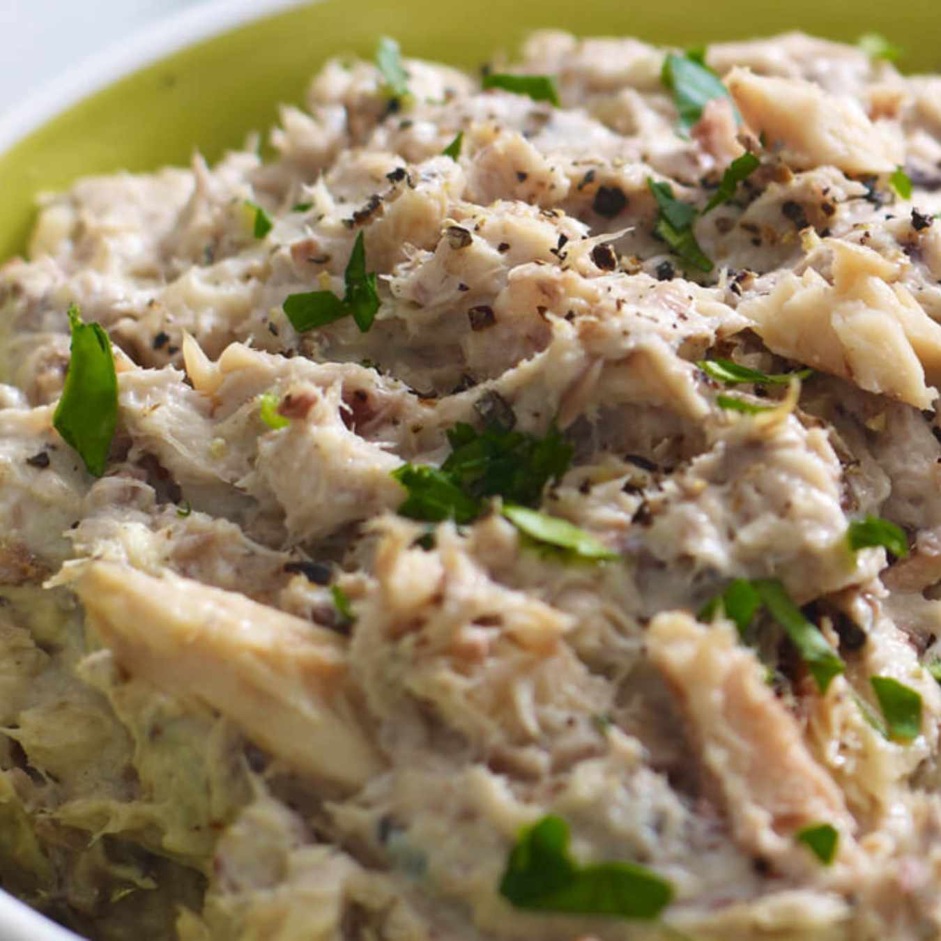 Trộn cá mòi với nụ bạch hoa, giấm, tỏi, cần tây, dưa chuột, muối và hạt tiêu trong một cái bát