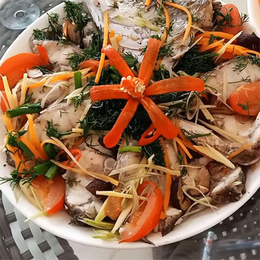 Đầu cá rửa sạch, bổ đôi, hàm dưới để nguyên tẩm ướp muối tiêu, bày vào đĩa hình bầu dục làm đầu của con cá