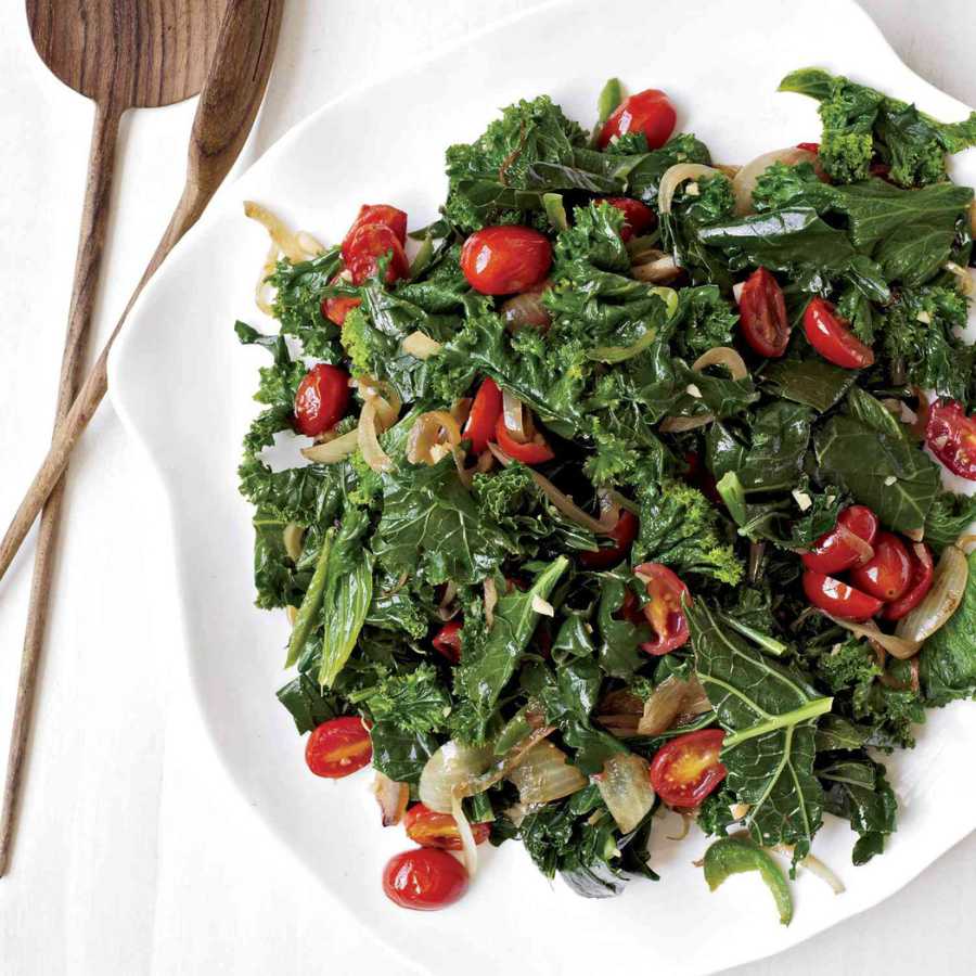 Làm nóng chảo với dầu ăn trên lửa vừa, thêm cải bẹ xanh, cải xoăn, cần tây và các thành phần nguyên liệu khác, đảo đều, áp chảo trong 10 phút, chia ra các đĩa và dùng nóng