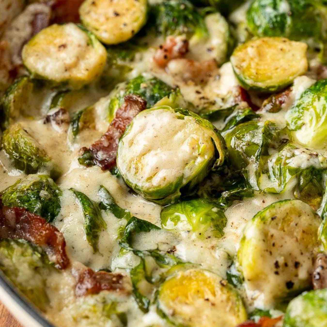 Dùng tăm xiên một nửa cải Brussel với thịt heo xông khói, tiếp theo là miếng phô mai lên trên, rồi đến phần cải Brussel còn lại và cố định bằng tăm