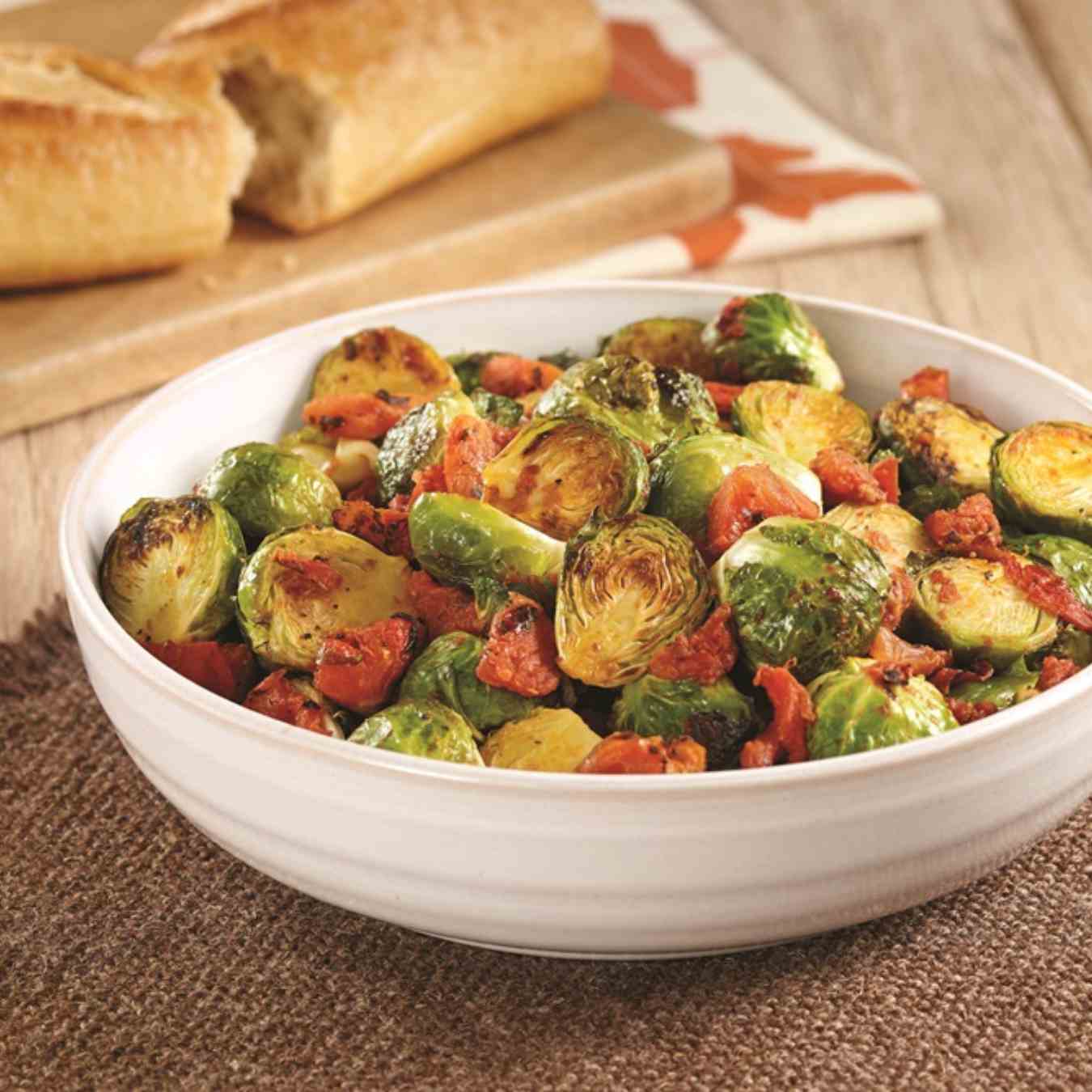 Dùng một cái khay nướng, cho cải Brussels với cà chua, hành lá và các thành phần khác vào, trộn đều và nướng ở nhiệt độ 200°C (400°F) trong 25 phút