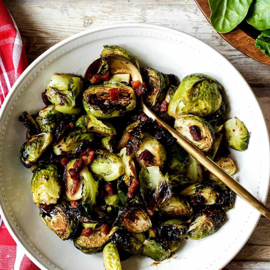 Dùng một chiếc chảo nướng, cho cải chíp với cải Brussels, dầu ôliu và các thành phần nguyên liệu khác vào, đảo đều và nướng ở nhiệt độ 200°C trong 30 phút. Chia hỗn hợp rau ra đĩa và thưởng thức