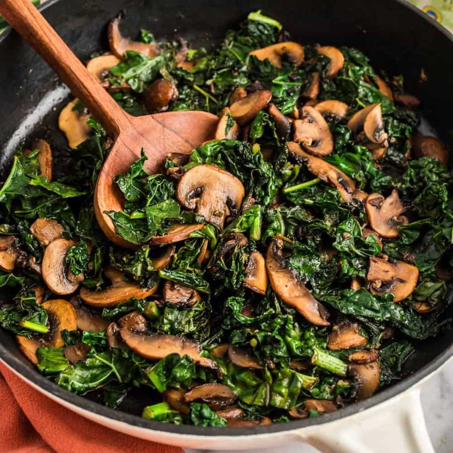 Thêm nấm Bella, cải xoăn và các thành phần nguyên liệu khác, đảo đều, nấu trên lửa vừa thêm 13 phút nữa, chia ra các đĩa và thưởng thức