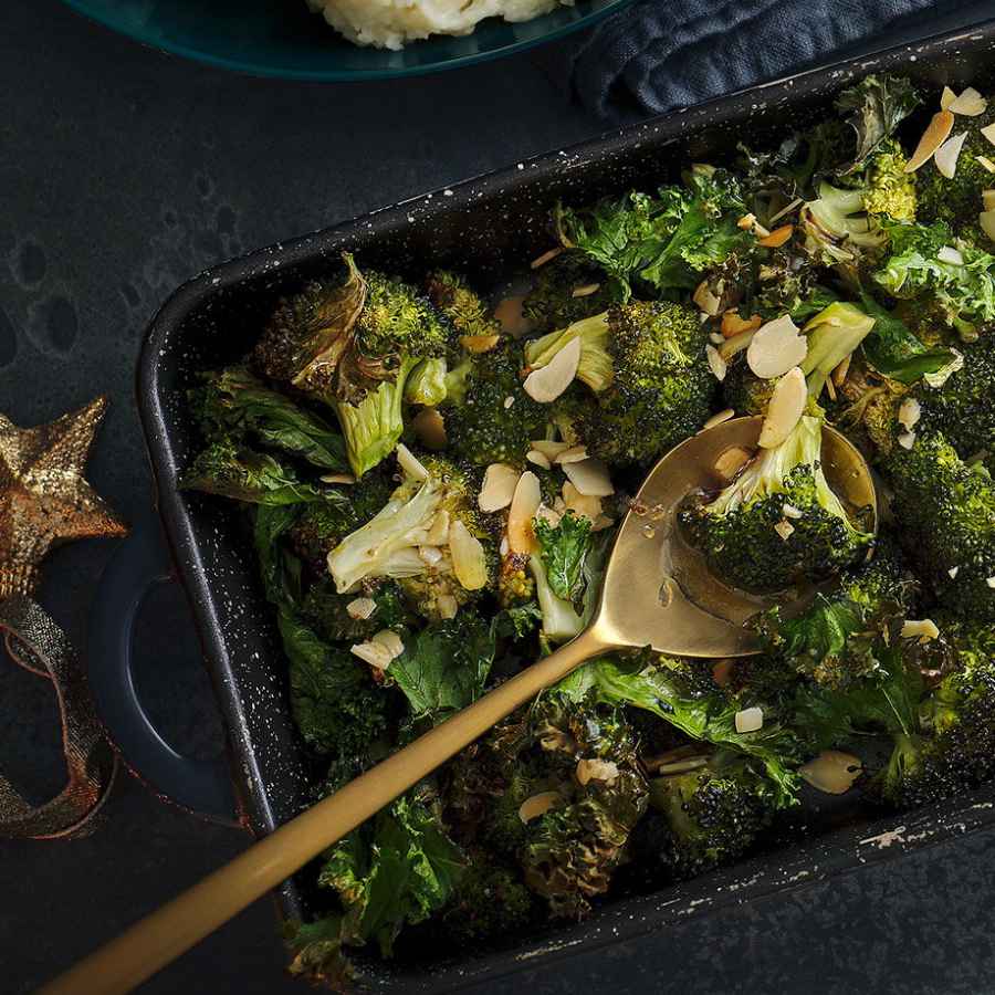 Dùng một chiếc chảo nướng, cho cải xoăn với cải cầu vồng, bông cải xanh và các thành phần nguyên liệu khác, đảo đều và nướng ở nhiệt độ 205°C trong 20 phút. Chia ra đĩa và thưởng thức