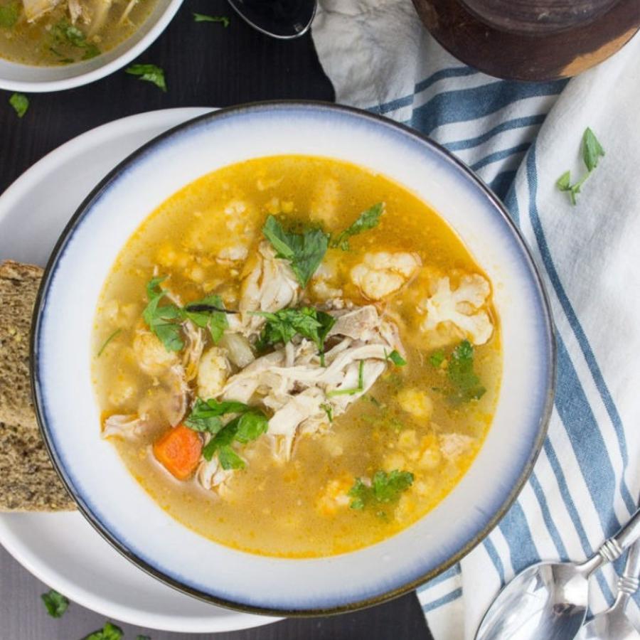 Nấu cho đến khi thịt gà và súp lơ chín tới có màu trắng, mùi thơm hành hoa, vị ngọt vừa ăn. Múc ra bát, ăn nóng