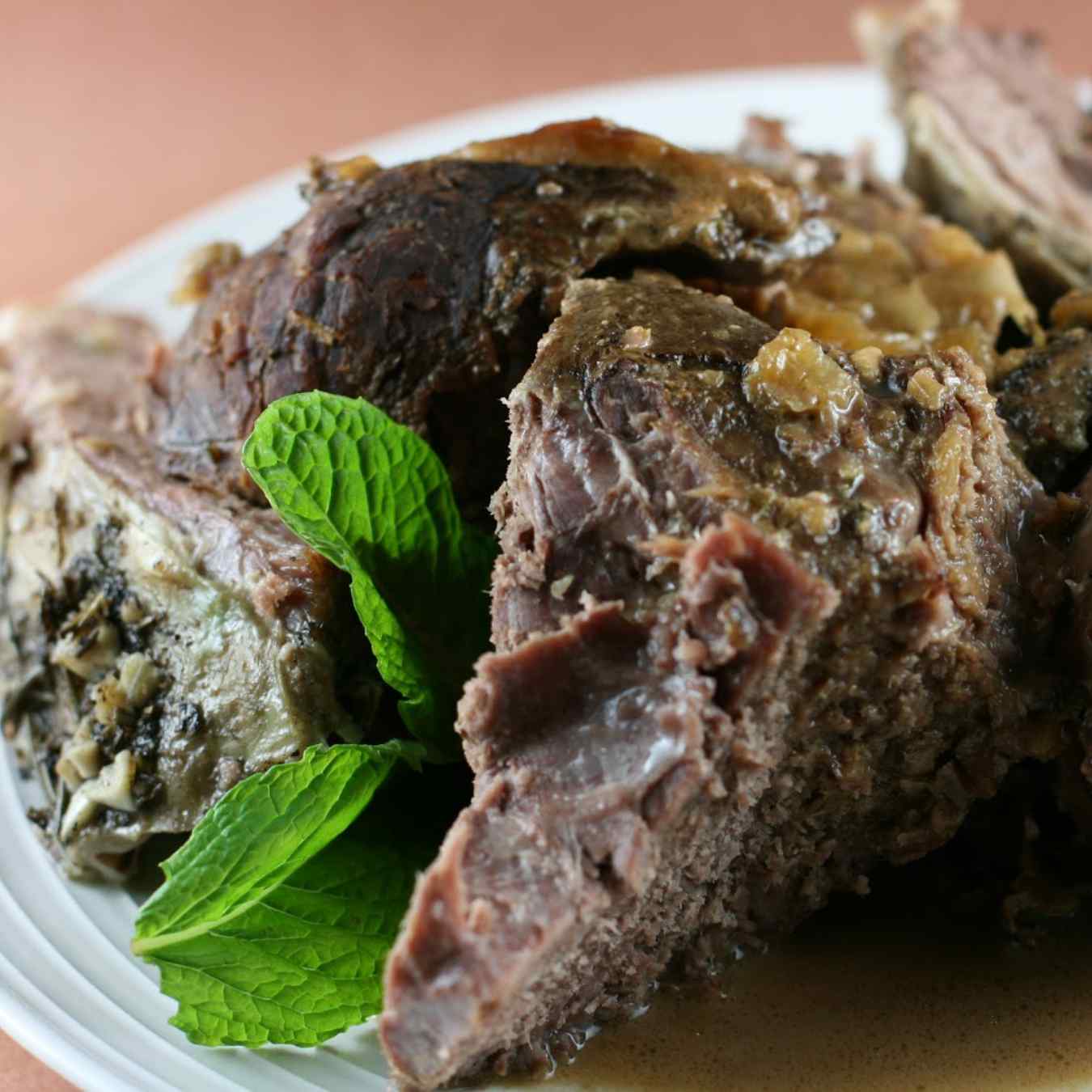 Rưới một ít dầu vào nồi nấu chậm và cho thịt cừu, chiết xuất cây phong, hương thảo, tỏi, nêm muối và hạt tiêu vào. Đậy vung và nấu trong 7 giờ ở nhiệt độ thấp