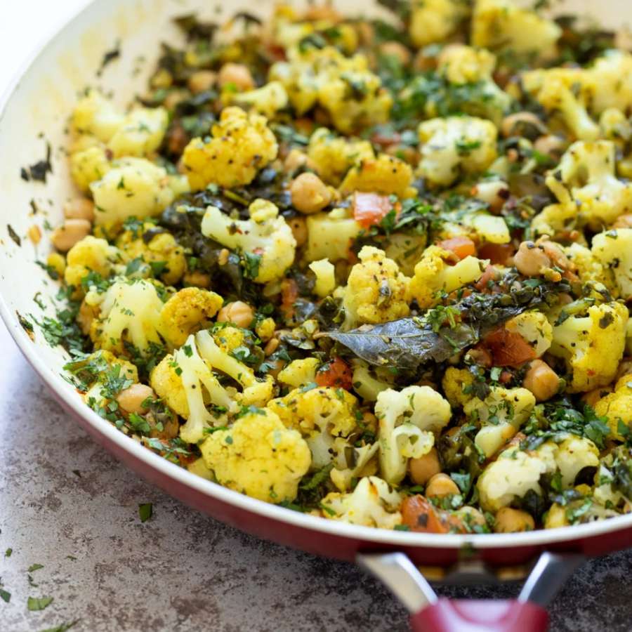 Làm nóng chảo với dầu ăn trên lửa vừa, cho cơm súp lơ, chà là, nghệ và quế vào xào trong 3 phút
