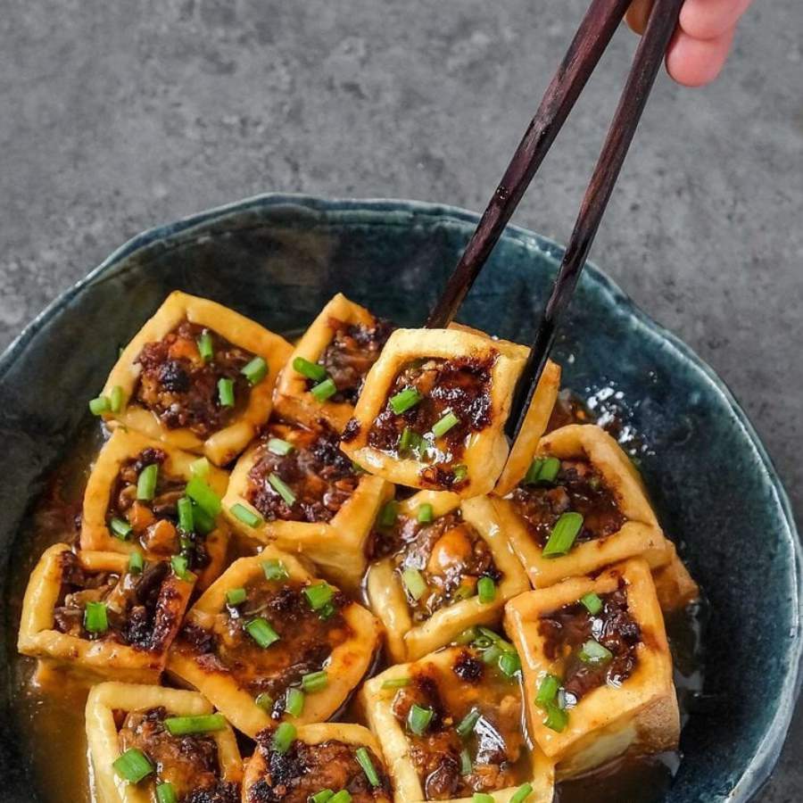 Cho đậu vào rán vàng cho đến khi đậu ngả màu vàng rơm, có mùi thơm và vị vừa ăn, đậu cắt đều miếng, thịt chắc không bã