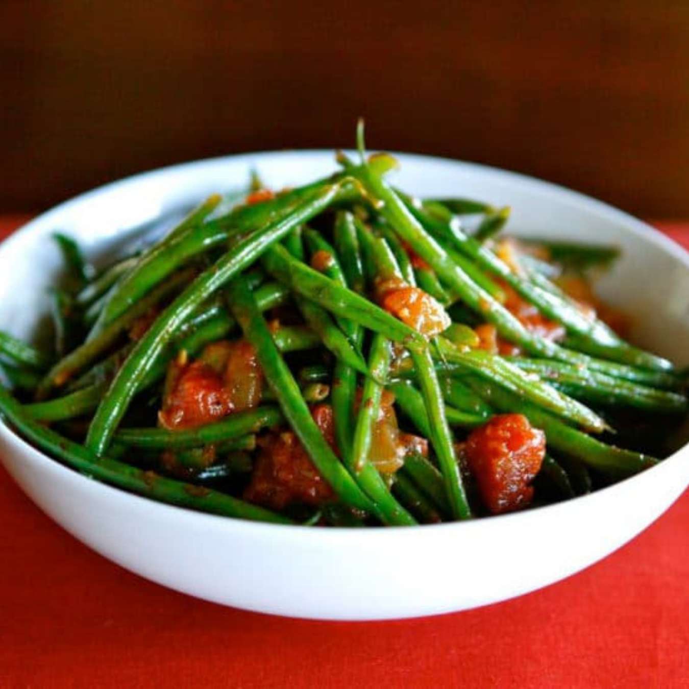 Cho đậu que, bơ và các nguyên liệu khác vào, đảo đều, xào trên lửa vừa trong 10 phút nữa, chia ra bát và dùng cho bữa sáng