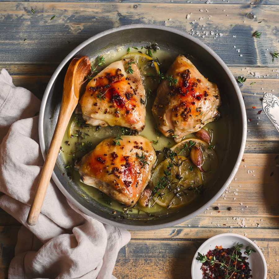 Ướp đùi gà với muối và hạt tiêu. Đặt một lát chanh lên mỗi miếng đùi gà và rắc một ít cỏ xả hương lên
