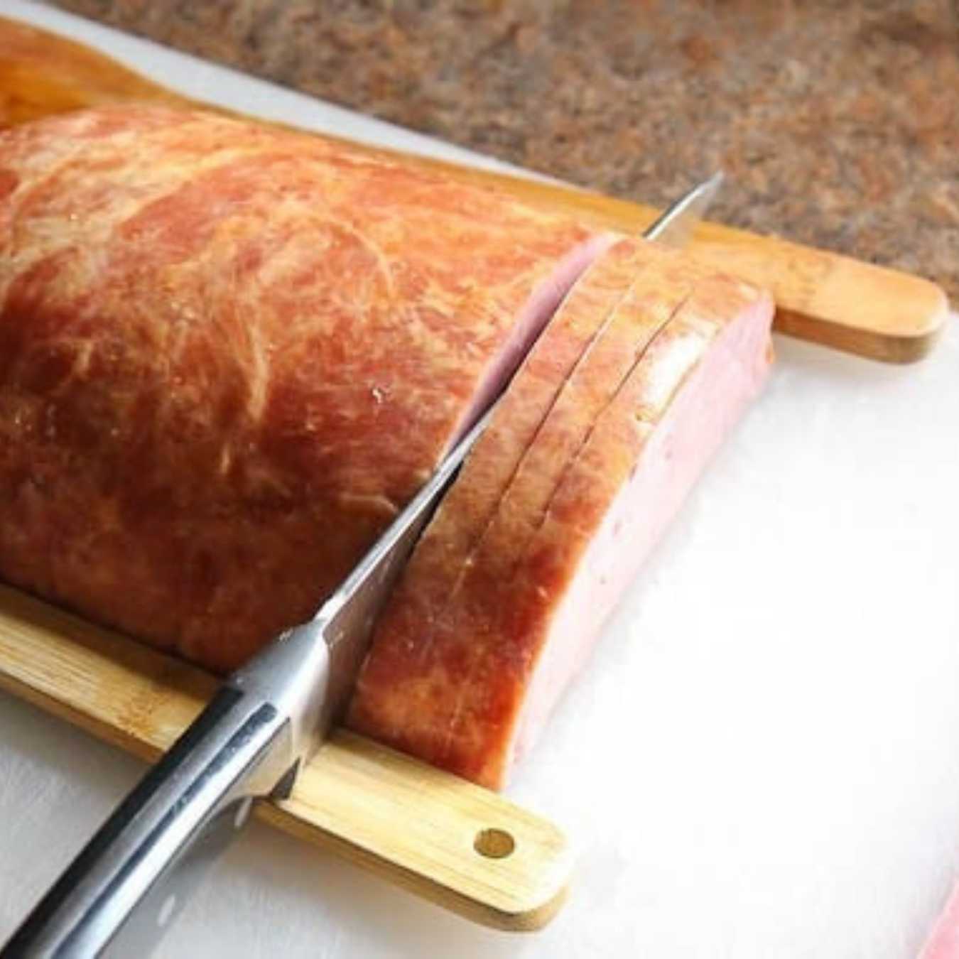 Đặt giăm bông lên thớt. Đặt hai chiếc thìa gỗ ở hai bên và dùng dao cắt thịt giăm bông đến cạnh thìa để tạo thành những lát cắt ngang (nhưng không cắt hết)