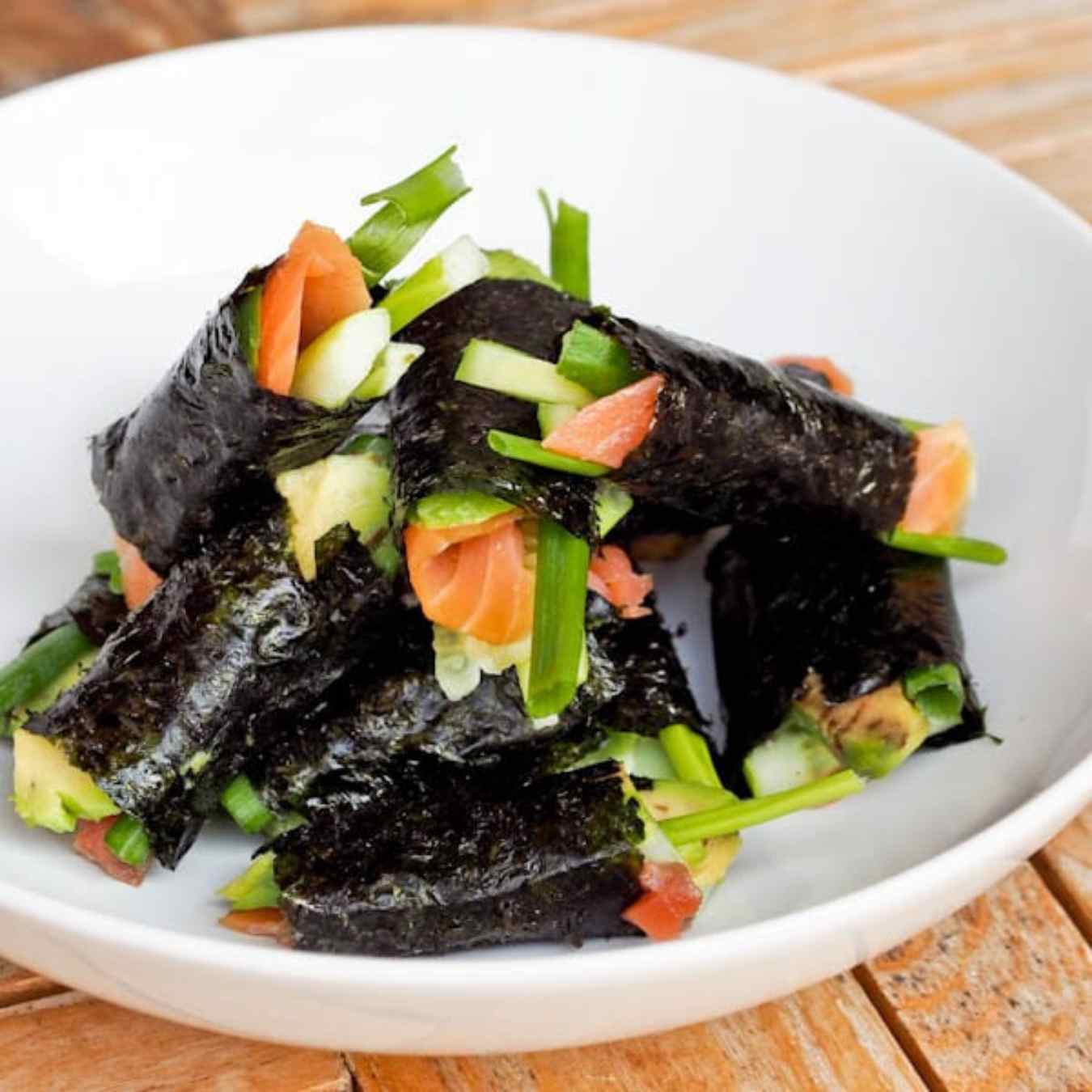 Rưới nước sốt đều lên cá hồi rồi cuộn tấm thảm sushi lại, nén kỹ, cắt thành 6 phần và ăn kèm với gừng ngâm chua
