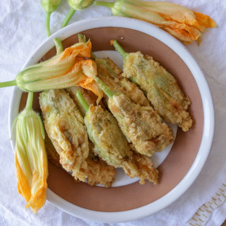 Hoa bí chọn loại to, mới cắt, bỏ cọng già, bỏ nhuỵ, ngâm hoa bí vào chậu nước lạnh cho ra hết bụi cát, úp ngược hoa xuống rổ cho ráo nước