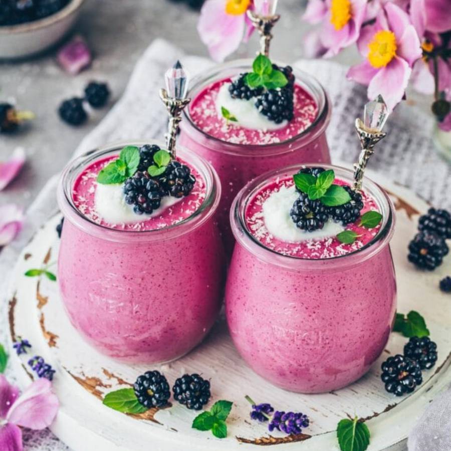 Cho kem cùng các loại quả mọng và các thành phần nguyên liệu khác (trừ nho khô) vào máy xay sinh tố, xay nhuyễn, chia vào từng cốc, rắc nho khô lên trên và để mát trước khi dùng