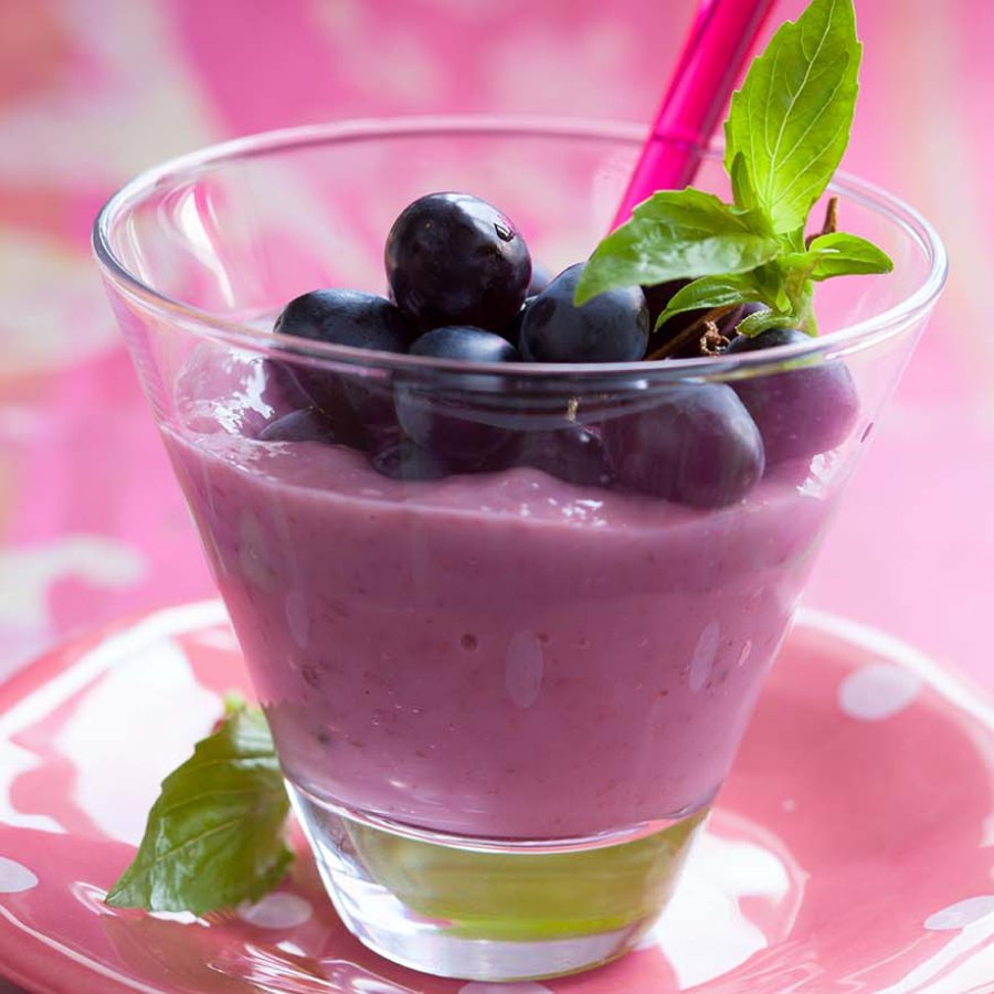 Dùng một cái bát, trộn nho với nước cốt dừa, sữa hạnh nhân và các thành phần nguyên liệu khác, đánh đều, chia vào từng cốc và để trong tủ lạnh 1 giờ trước khi dùng