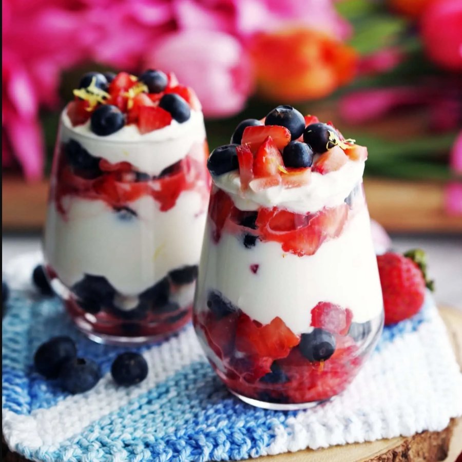 Cho dâu tây với quả việt quất và các thành phần nguyên liệu khác vào máy xay sinh tố, xay nhuyễn, chia vào từng cốc và để trong tủ lạnh 2 giờ trước khi dùng
