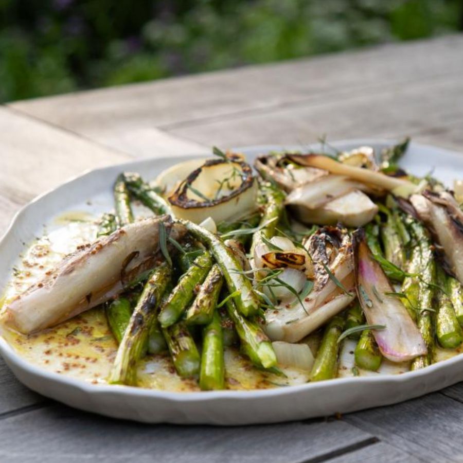Làm nóng chảo với dầu ăn trên lửa vừa, thêm rau diếp trắng, măng tây, bơ và các thành phần nguyên liệu khác vào, đảo đều, nấu trong 10 phút, chia ra các đĩa và thưởng thức