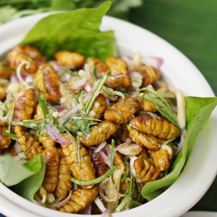 Phi thơm hành rồi cho thịt vào xào chín, cho tiếp nhộng vào đảo đều rồi xúc ra đĩa