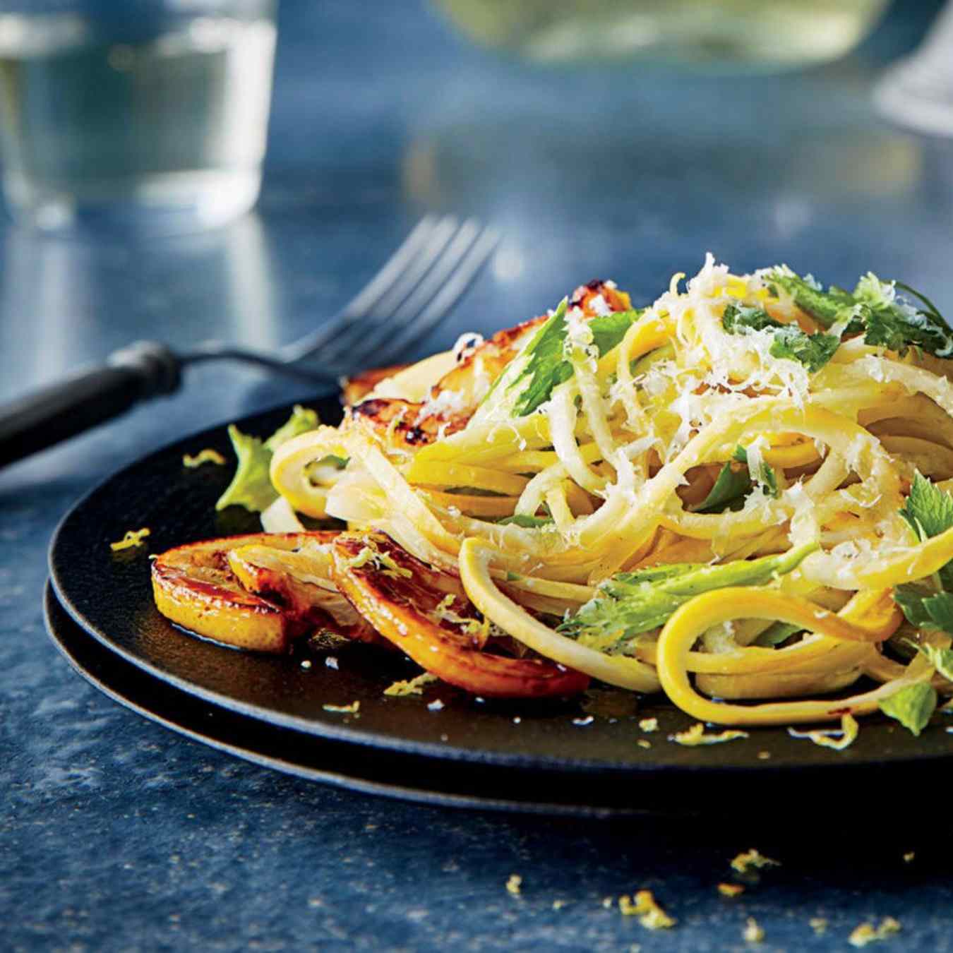 Cho mì bí ngòi lên khay nướng có lót giấy nến rồi cho hành tây và ớt chuông vào