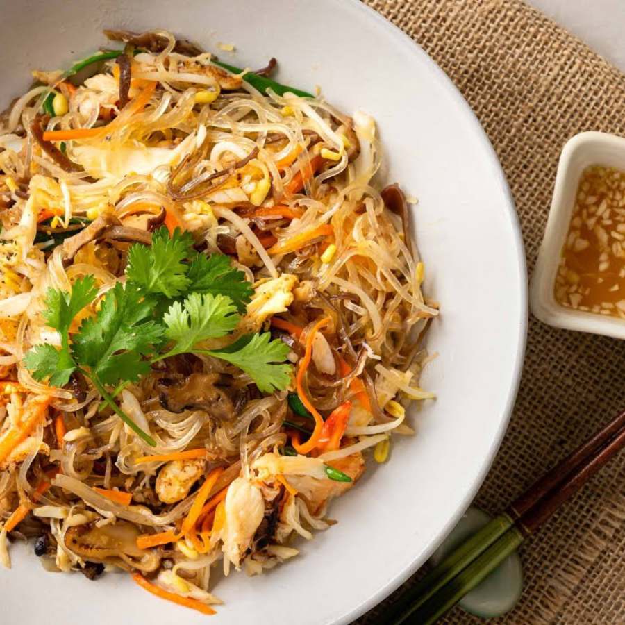 Cho thêm mỡ vào chảo, đổ miến Shirataki vào xào nêm một chút nước mắm, mì chính, nước dùng cua và xào săn, đổ thịt, cua vào trộn đều cùng với hành hoa
