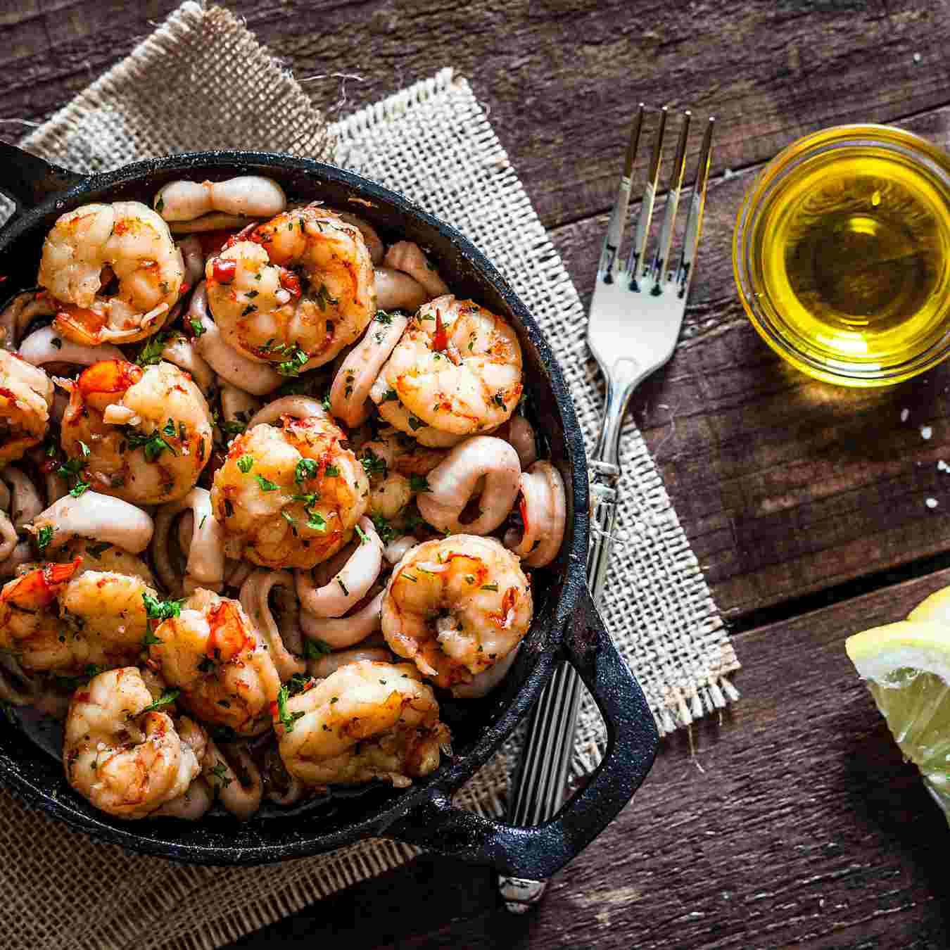Phủ hỗn hợp lên mực và tôm, xếp tất cả lên khay nướng đã lót sẵn giấy bạc, cho vào lò nướng ở nhiệt độ 200ºC (400ºF) và nướng trong 10 phút