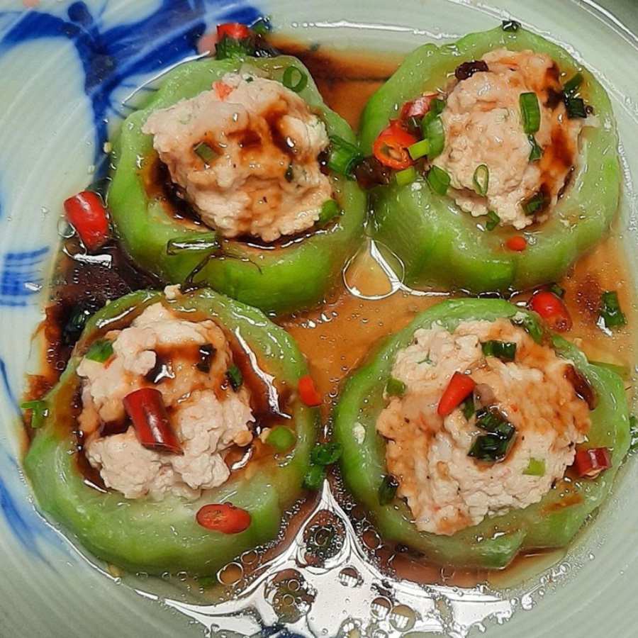 Trộn lẫn thịt nạc, tôm, mộc nhĩ, nấm hương, hành khô, băm nhỏ, nước mắm, mì chính, hạt tiêu, nhồi vào trái mướp đắng