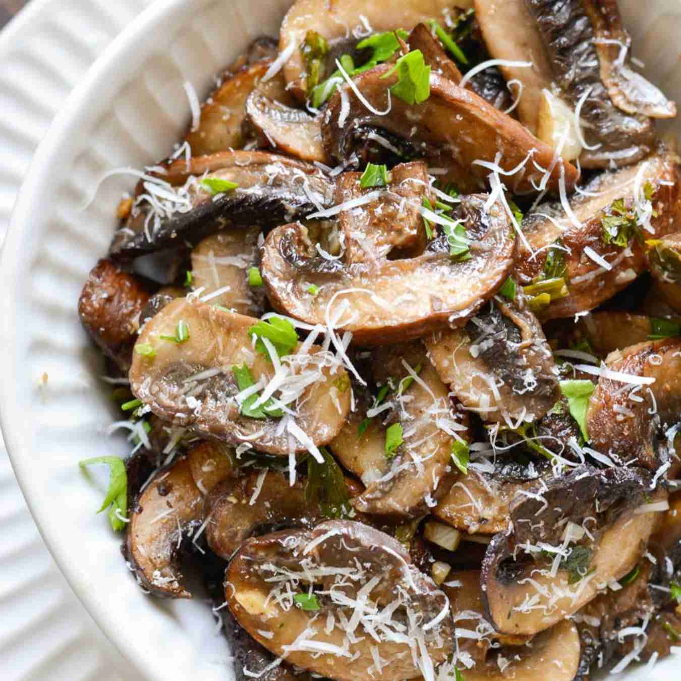 Phét dầu lên khay nướng và trộn nấm với vỏ chanh, nước trái cây, phô mai, cỏ xạ hương, muối, tiêu và tỏi
