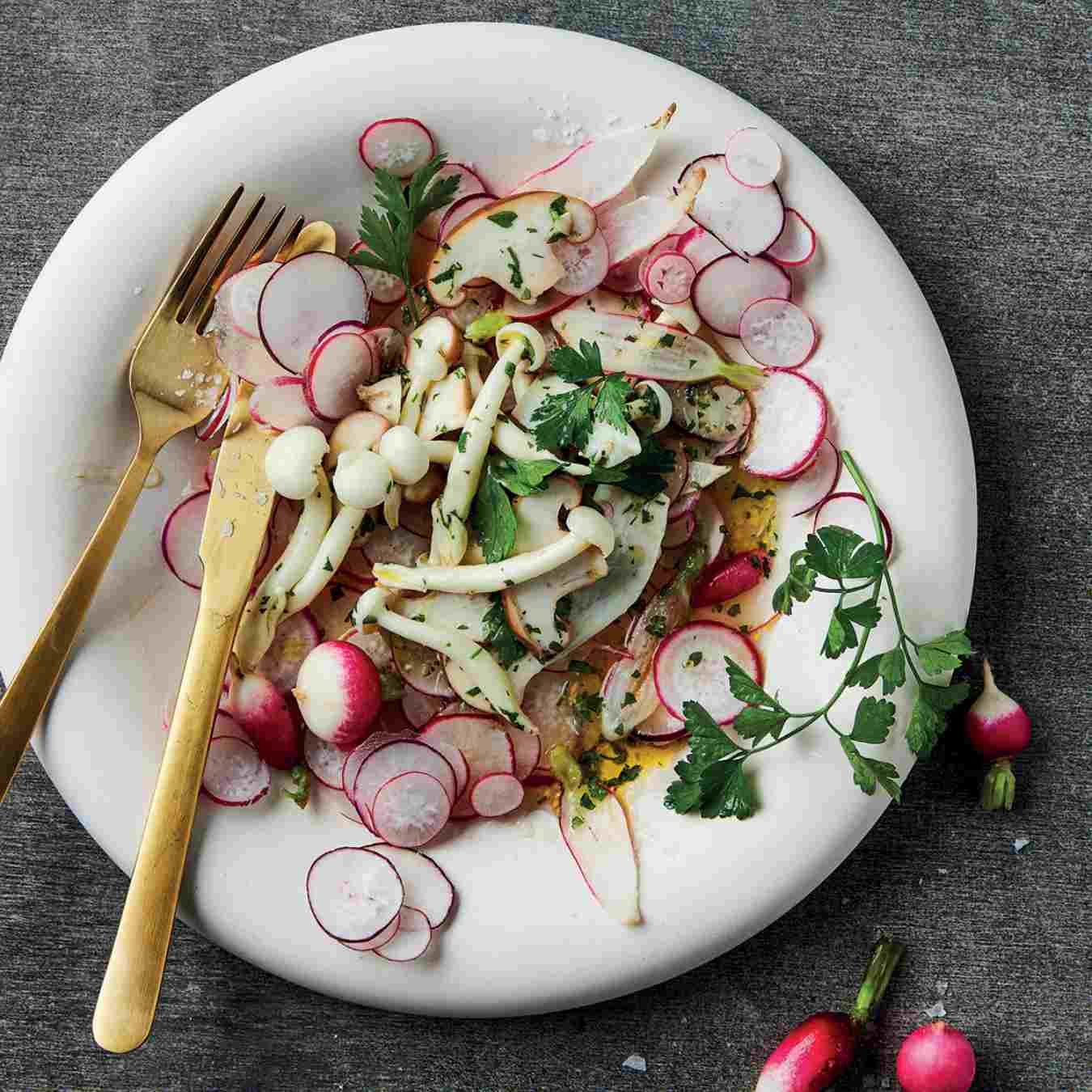 Cho nấm, củ cải và các nguyên liệu khác vào, nấu trên lửa vừa trong 20 phút, chia ra đĩa và thưởng thức
