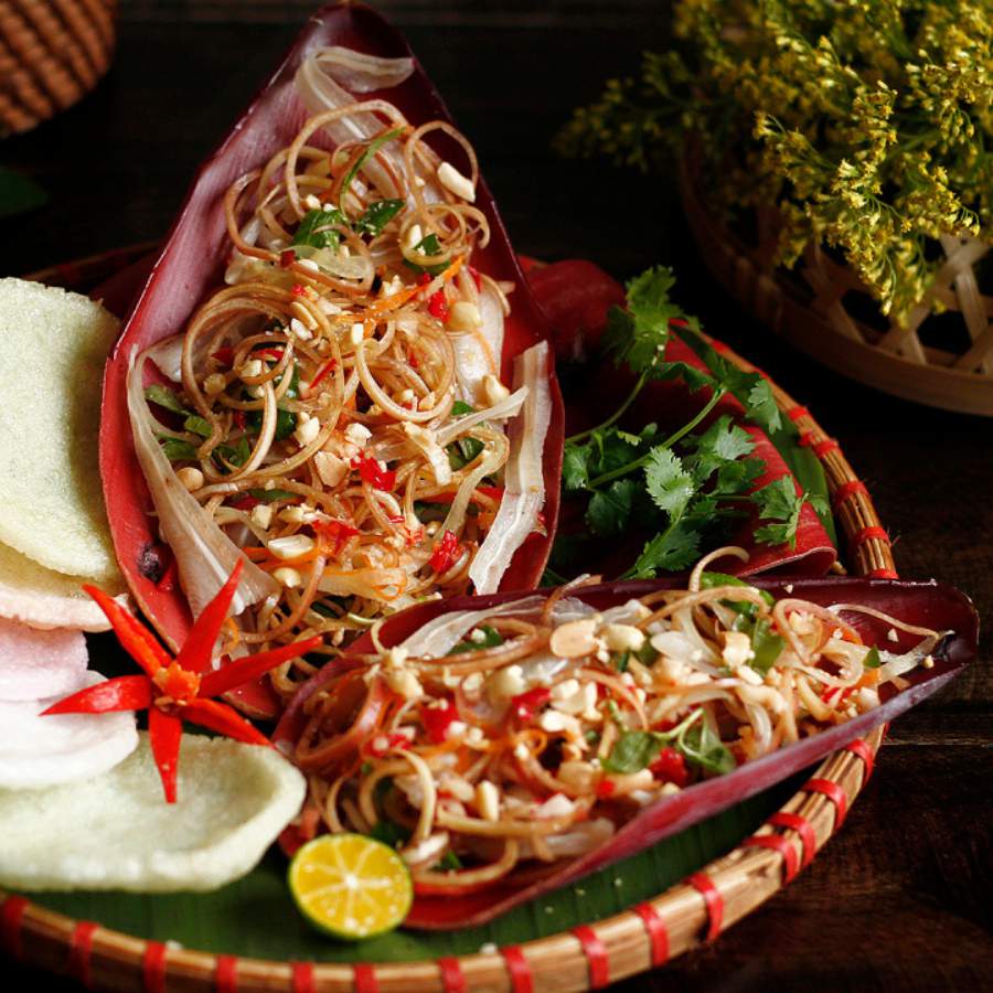 Cho hoa chuối, giá, ½ thịt tai heo, ớt vào bát rồi rưới nước mắm chanh, ớt, đường ăn kiêng, mì chính, rau thơm, rau mùi thái nhỏ, cuối cùng trộn đều lạc, vừng. Chia ra đĩa, rắc tôm bông, thịt, rau thơm, rau mùi lên trên. Ăn nguội