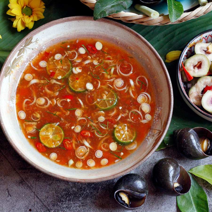 Thái mỏng quất, băm nhỏ tỏi và thái sợi lá chanh. Cho đường, nước mắm, giấm, tương ớt vào bát và hoà tan các thành phần sau đó cho thêm tỏi, quất thái mỏng, lá chanh và trộn đều