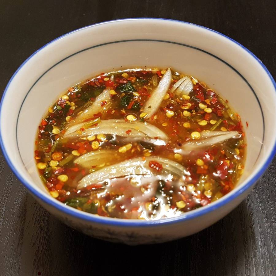 Lột vỏ, thái mỏng hành củ tím. Băm nhỏ tỏi, ớt và rau mùi. Cho vào bát nước mắm, nước cốt chanh, đường cát trắng, nước đun sôi để nguội và khuấy đều. Sau đó cho tỏi, ớt, hành, rau mùi, hạt tiêu vào bát và trộn tất cả các thành phần lại với nhau