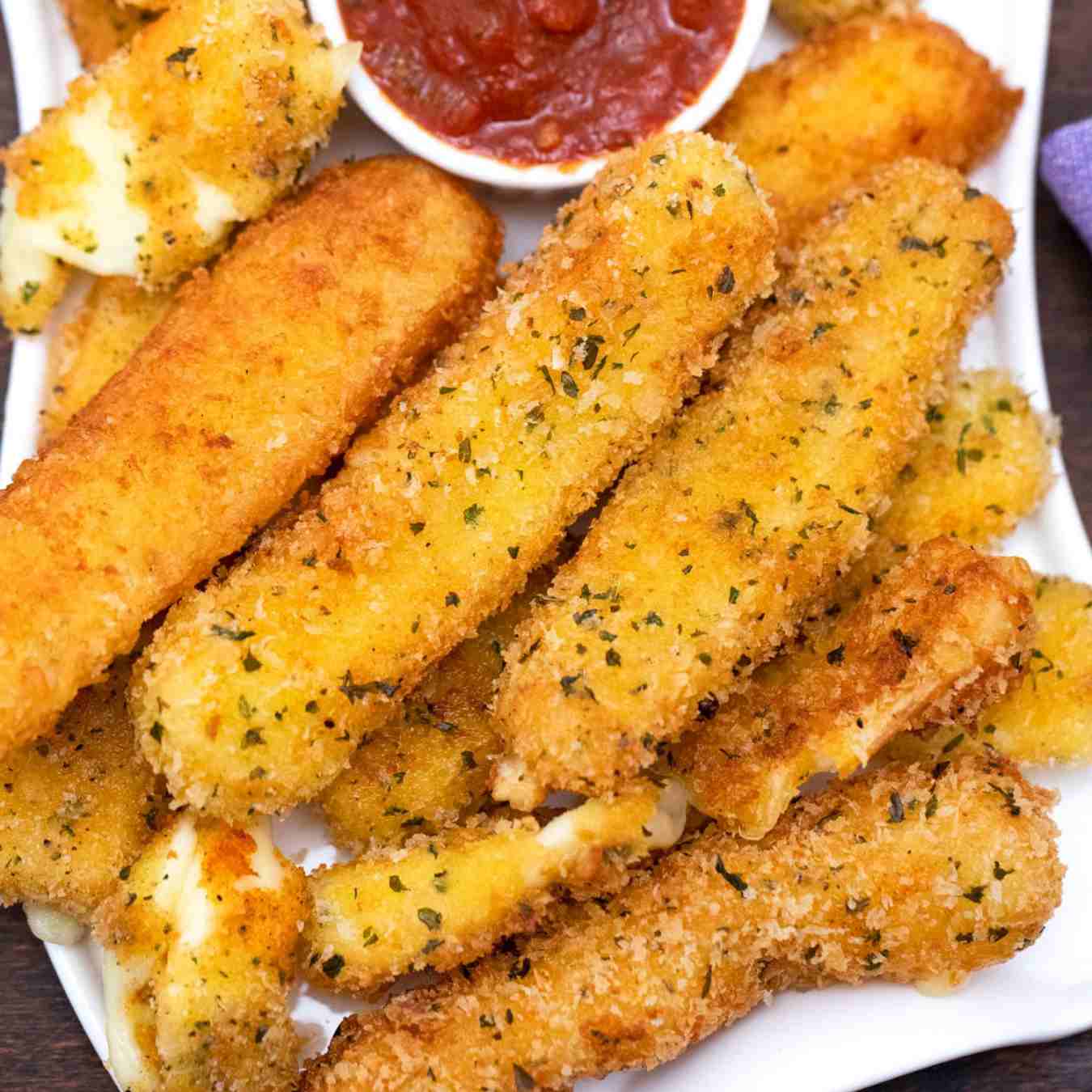 Cho trứng đã đánh bông vào một bát khác. Nhúng que phô mai Mozzarella vào hỗn hợp trứng, sau đó nhúng qua hỗn hợp phô mai