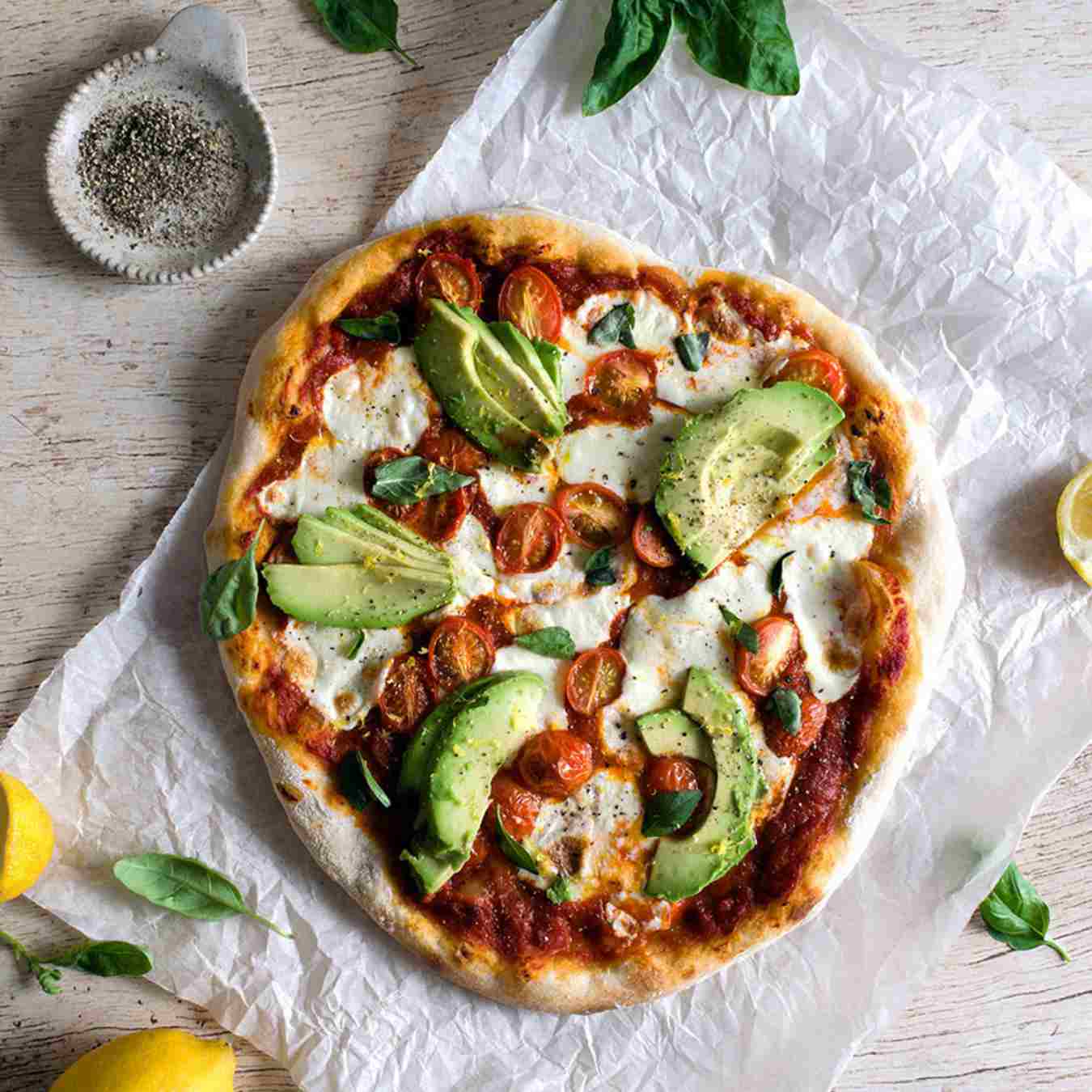 Để bột lên mặt bàn bếp, cán thành một hình tròn giống bánh Pizza rồi chuyển vào khay nướng có lót sẵn giấy nến và nướng ở nhiệt độ 200°C (400°F) trong 10 phút
