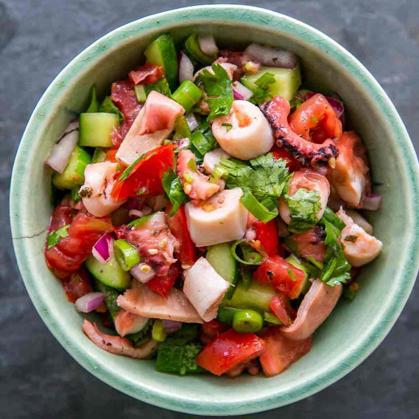Cắt nhỏ bạch tuộc và cho vào bát salad