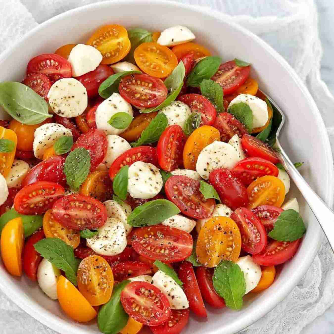 Dùng bát salad, trộn phô mai Bocconcini với cà chua và húng quế. Thêm nước sốt, rưới phủ đều và thưởng thức
