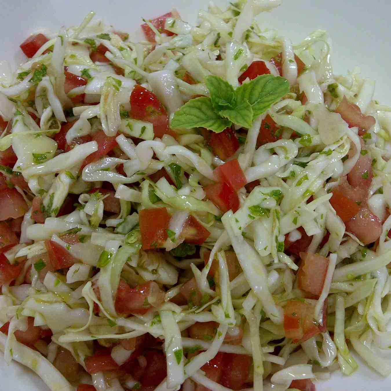 Dùng một cái bát, trộn bắp cải với cà chua và các thành phần nguyên liệu khác, trộn đều và thưởng thức cho bữa sáng