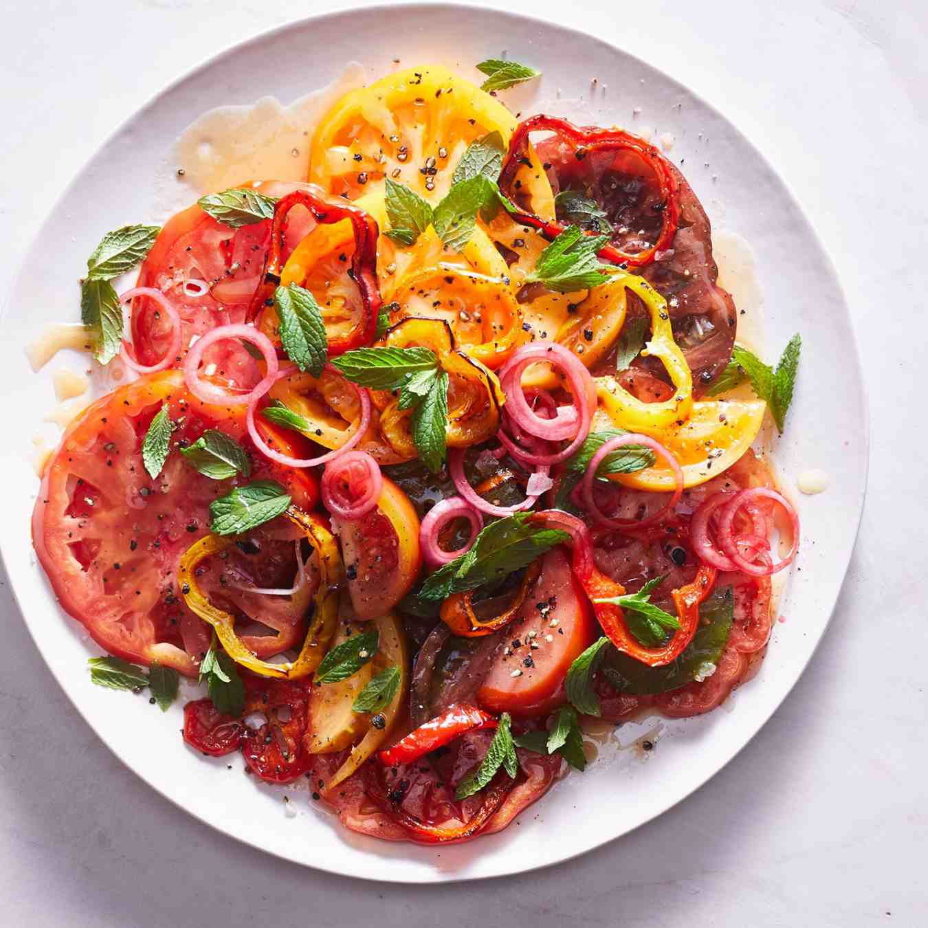 Dùng một cái bát, trộn cà chua với ớt và các thành phần khác, trộn đều và thưởng thức